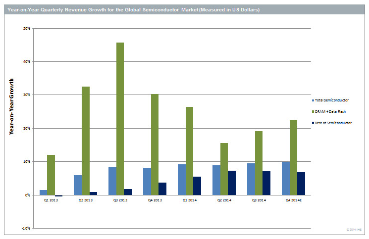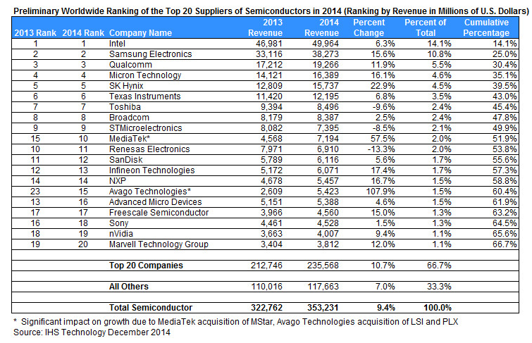 Аналитики IHS в своем последнем отчете отметили, что, по предварительным подсчетам, 2014 год оказался достаточно успешным для лидеров полупроводниковой индустрии. Доход первой двадцатки компаний вырос с $212,7 млрд до $235,6 млрд (прирост — 10,7%), в то же время общий объем рынка увеличился на 9,4% и составил $332,8 млрд. Подобных успехов полупроводниковая промышленность не знала с 2010 г.