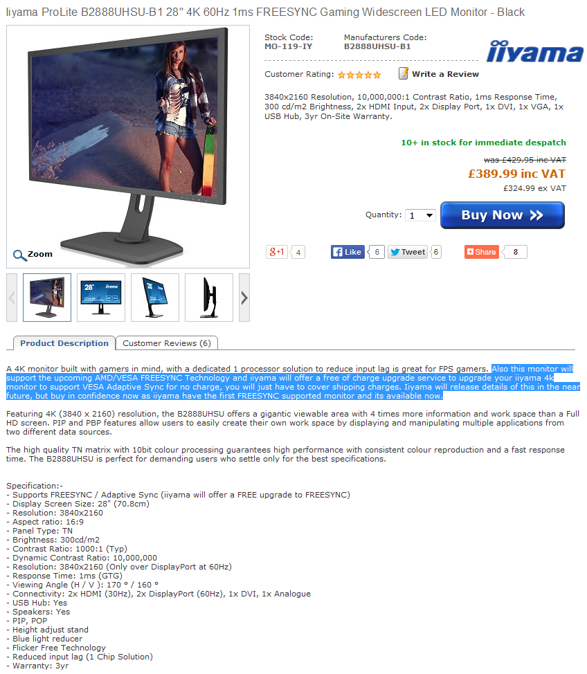 В описании продукта подчеркивается, что владельцы ProLite B2888UHSU-B1 смогут подать заявку на FreeSync-апгрейд и, потратив несколько десятков долларов на пересылку, получить уже усовершенствованный дисплей. Каким именно манипуляциям при этом подвергнется монитор, не уточняется.
