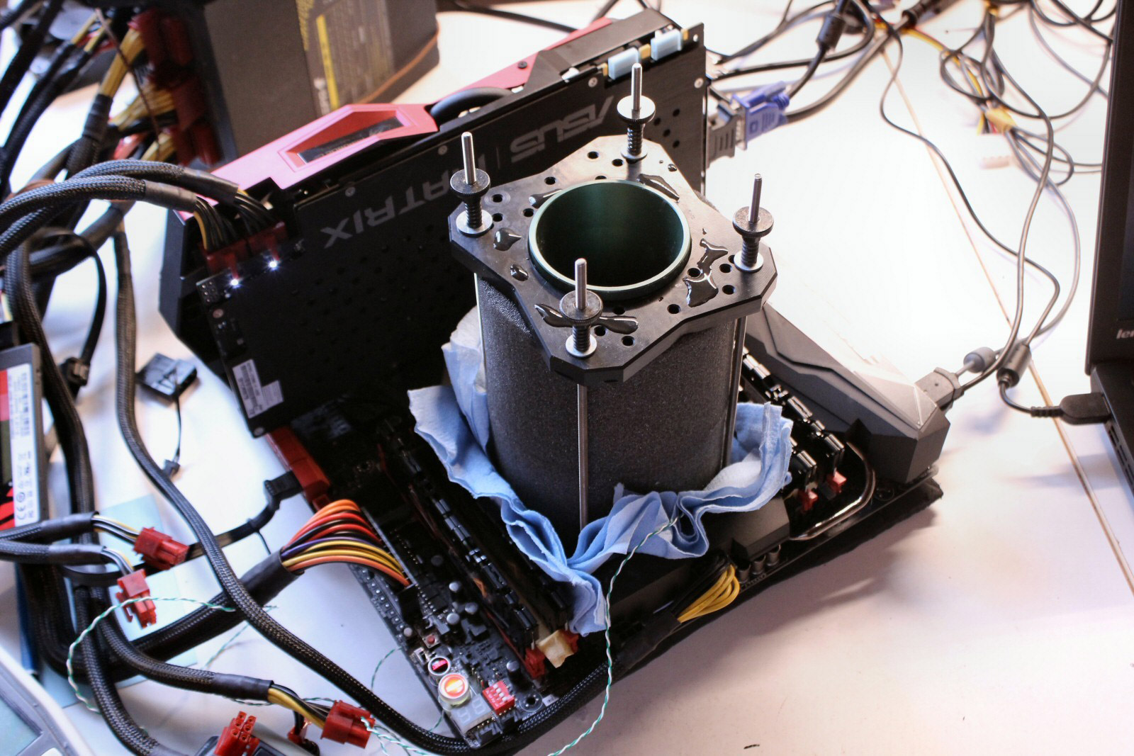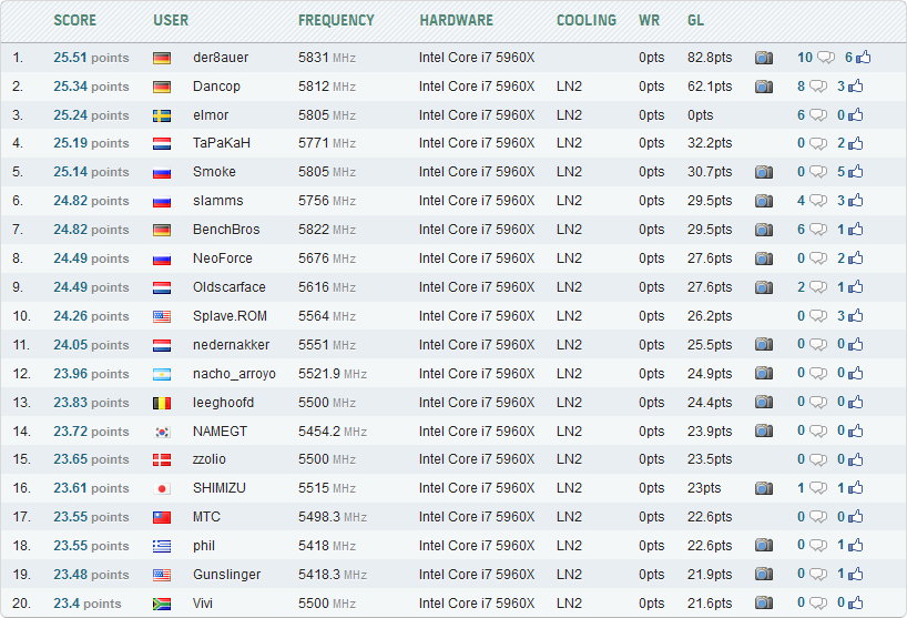 Топ-20 категории Cinebench R11.5 8xCPU на HWBot.org сегодня занят настоящими «тяжеловесами», поскольку для того, чтобы конкурировать с лучшими, здесь требуется потратиться на Intel Core i7-5960X. Накануне первое место в этой дисциплине взял Роман «Der8auer» Хартунг с результатом 25,51 очка. Рецепт успеха — отборный 8-ядерный Haswell-E (@5830 МГц, 1,68 В), память G.Skill Ripjaws 4 DDR4 с эффективной частотой 3042 МГц и таймингами 12-15-15, материнская плата Asus Rampage V Extreme и испаритель для жидкого азота, спроектированный самим Der8auer.