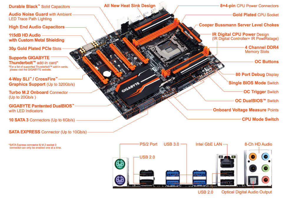В Gigabyte постарались создать универсальный инструмент для сбора урожая рекордов в процессорных и графических бенчмарках, и это, судя по многочисленным записям на HWBot.org, тайваньцам удалось. Освежить в памяти характеристики Gigabyte GA-X99-SOC Champion можно, ознакомившись с нижеприведенным эскизом. Отметим лишь, что конфигурации 4-Way SLI и CrossFireX будут поддерживаться только при установке процессора Intel Core i7-5960X или Core i7-5930K. Наличие в системе чипа Core i7-5820K позволит задействовать лишь три видеокарты одновременно.