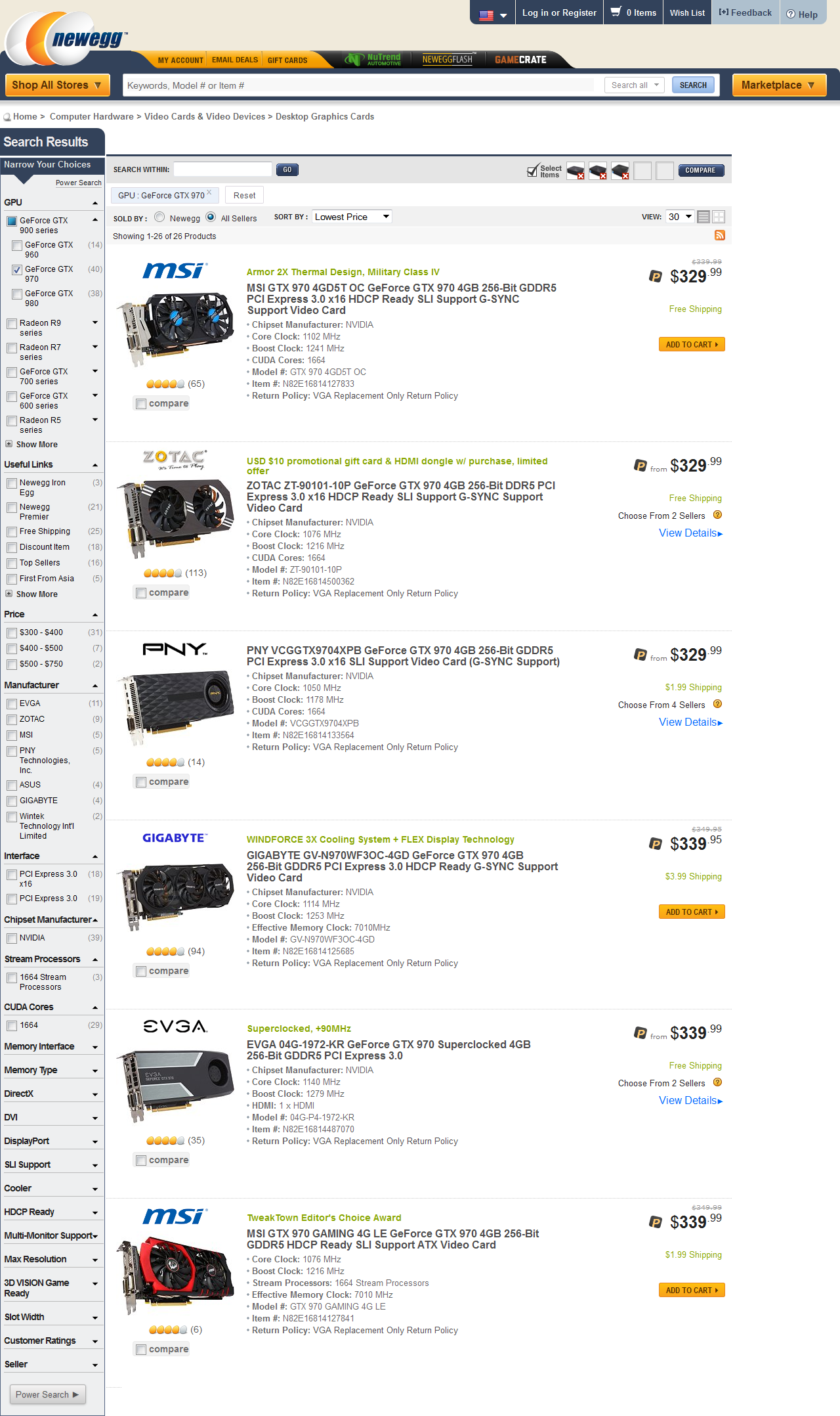 GeForce GTX 970 удерживается на том же ценовом уровне, что и в первые дни продаж — $330 и выше. На указанную сумму можно купить видеокарту MSI GTX 970 4GD5T OC или Zotac GTX 970. Учитывая примерный паритет между GeForce GTX 970 и Radeon R9 290X по среднему fps, делаем вывод, что наценка за бренд «Nvidia» составляет приблизительно 30–40 долларов, с поправкой на большее энергопотребление Hawaii XT.