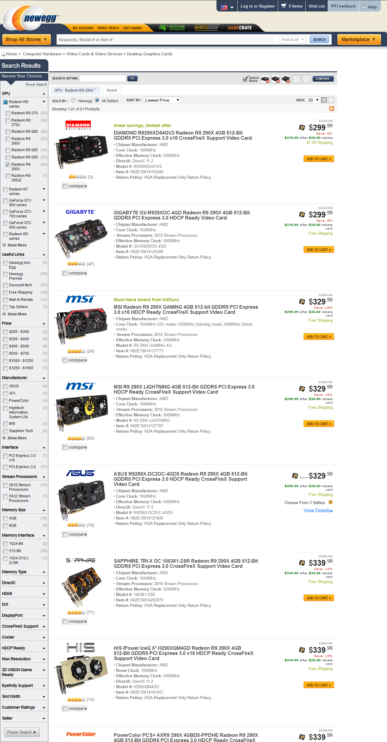 Несмотря ни на что, спрос на GeForce GTX 980 и GTX 970 остается высоким, и из-за этого отдельные карты на чипе AMD Hawaii продаются по совсем уж бросовым ценам. Например, за Gigabyte GV-R929XOC-4GD (представитель серии R9 290X с частотами 1040/5000 МГц) в США просят всего $280 с учетом рибейта, при этом доставка осуществляется бесплатно.