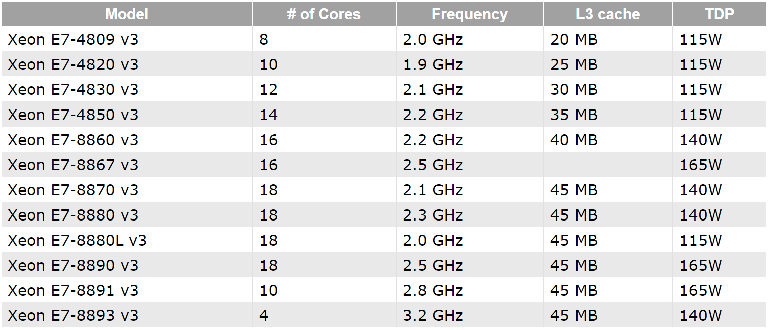 По сравнению с серией Xeon E7 v2 количество моделей заметно сократилось — с 19 до 12 ед. Линейка может похвастаться разнообразием: варианты от 4 до 18 ядер, с разной частотой и большой разницей в кэш-памяти L3. Отдельного упоминания стоят модели E7-8890 v3 и E7-8893 v3. Первая получила 18 ядер, работающих на частоте 2,5 ГГц, 45 МБ кэш-памяти третьего уровня и внушительный TDP в 165 Вт. E7-8893 v3 обладает всего четырьмя ядрами, но повышенной частотой (3,2 ГГц), аналогичным количеством памяти и меньшим TDP — 140 Вт.