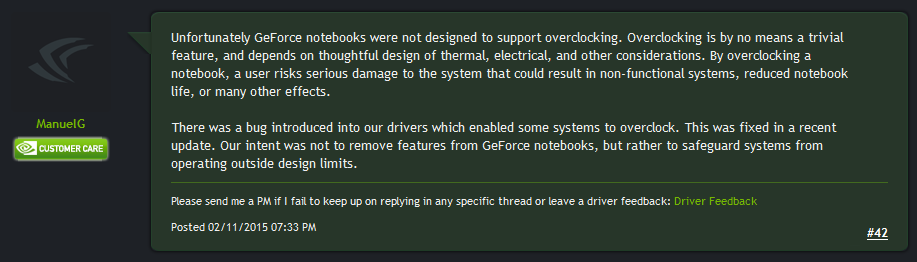 Некоторые владельцы ноутбуков, оснащенных устройствами серии GeForce GTX 900M (980M, 970M, 965M), были неприятно удивлены тем, что после установки пакета драйверов GeForce 347.29 их разогнанные графические адаптеры заработали на номинальных частотах и более не поддавались разгону. Пользователи поспешили проинформировать о случившемся Nvidia и получили довольно неожиданный ответ, суть которого сводилась к тому, что: а) GeForce-ноутбуки не проектировались с учетом поддержки оверклокинга; б) разгоняя лэптоп, вы рискуете причинить ему серьезный вред; в) возможность повышения частот GeForce GTX 900M изначально была «багом» и обновление драйвера позволило его исправить.