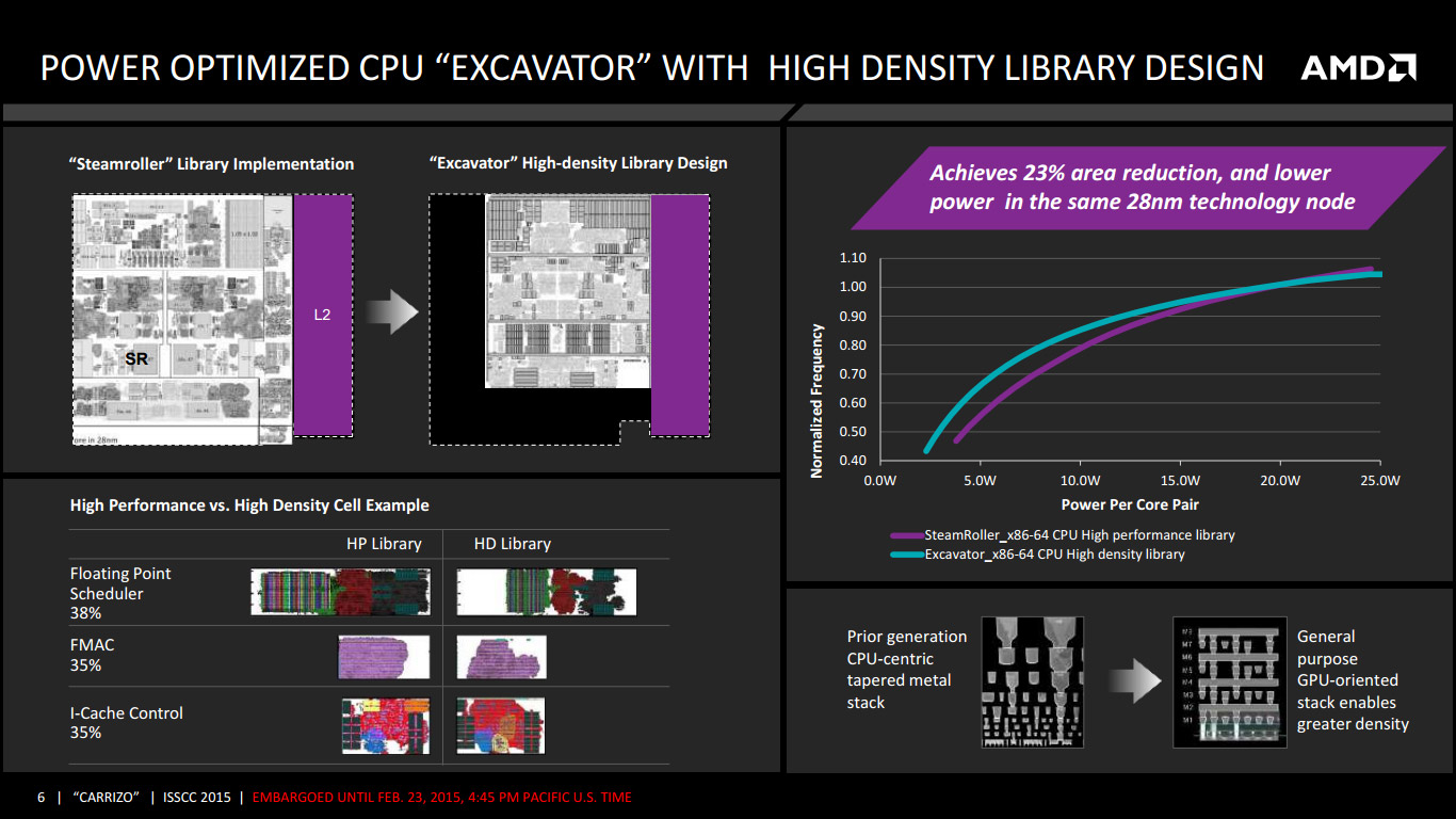 вычислительные блоки Excavator: +5% IPC (инструкций за цикл), энергопотребление — на 40% ниже, площадь — на 23% меньше;