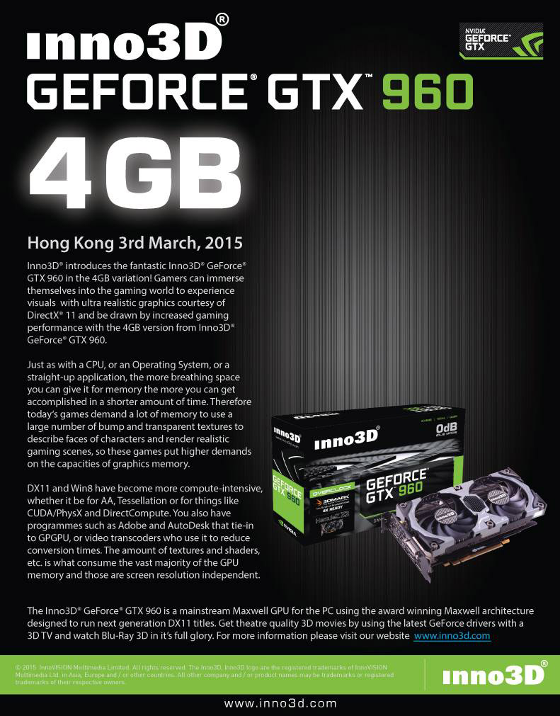 Одной из особенностей новинки является бесшумная работа при малой загрузке GPU (в режиме рабочего стола или при запуске казуальных игр). С ценой 4 ГБ версии GeForce GTX 960 компания-производитель пока не определилась.
