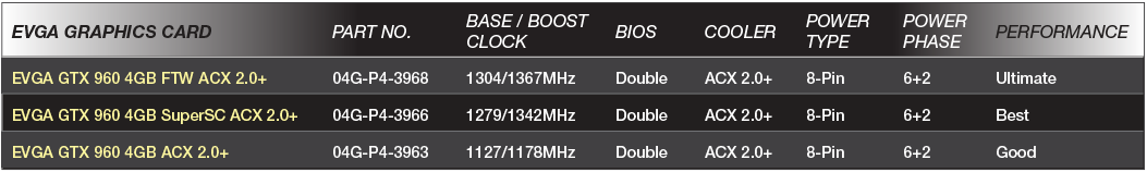 Накануне эксклюзивный AIB-партнер Nvidia, компания EVGA анонсировала трио видеокарт GeForce GTX 960 с 4 ГБ памяти на борту, особо выделив модель с замысловатым названием GeForce GTX 960 4GB SuperSC ACX 2.0+ (кодовое — 04G-P4-3966). Ее частоты повышены до следующих значений: 1279–1342 МГц для ядра GM206 и 7012 МГц для чипов буферной памяти.
