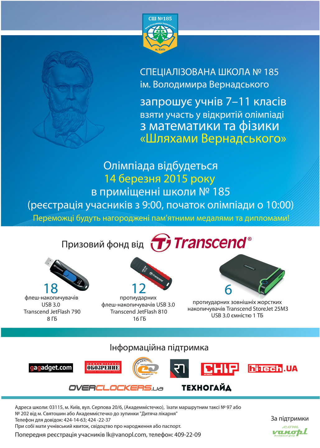 К олимпиаде «Дорогами Вернадского» допускаются ученики 7-11 классов. Ее начало запланировано на 14 марта, 10:00 (регистрация участников начнется в 9.00), а награждение пройдет 17 марта в 14:00, в актовом зале СШ №185.