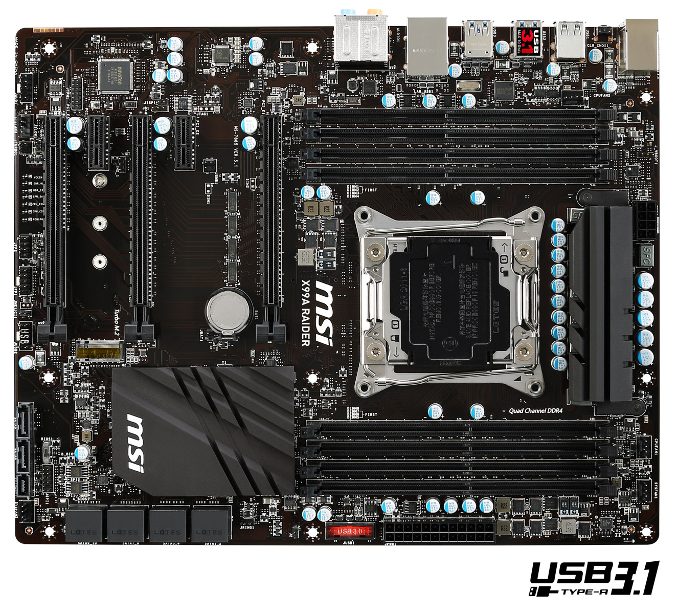 «Воинственная» модель MSI X99A Raider выполнена в строгой черной расцветке и предлагает восемь фаз питания процессорного сокета LGA2011-3 (поддерживаются CPU Haswell-E). Ее размеры — 305x244 мм.