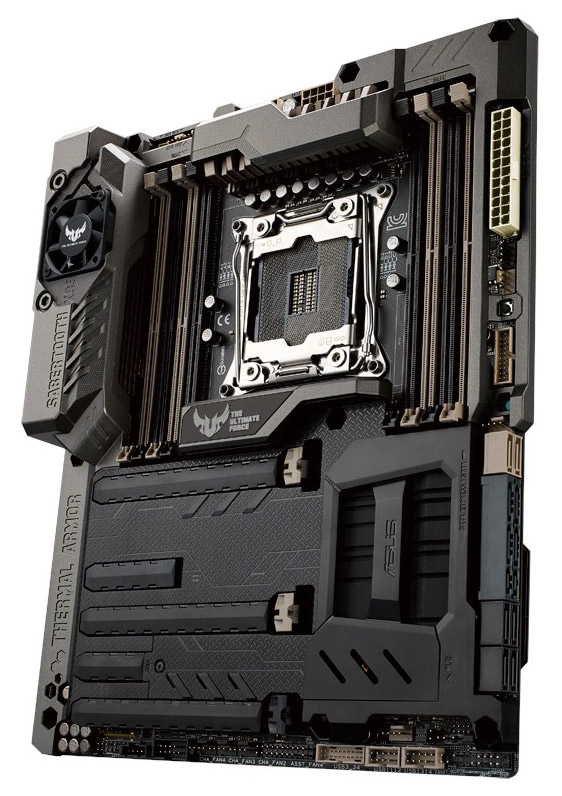 Новинка оснащена защитным кожухом с обеих сторон PCB, небольшим вентилятором в районе панели I/O и имеет типичную для плат серии Asus Sabertooth расцветку. Новая модель позволяет установить CPU Core i7-5820K, 5930K или 5960X (сокет запитан от восьми фаз), 64 ГБ оперативной памяти DDR4-2133/2400, три видеокарты, объединенные в связку 3-Way SLI или 3-Way CrossFireX (x16/x16/x16 или x16/x8/x4), карты расширения PCI-E x4 и PCI-E x1. Портов Serial ATA 6 Гбит/с целых десять, причем к четырем из них можно подключить два SATA Express накопителя. Под кожухом также распаян разъем M.2 Socket 3.
