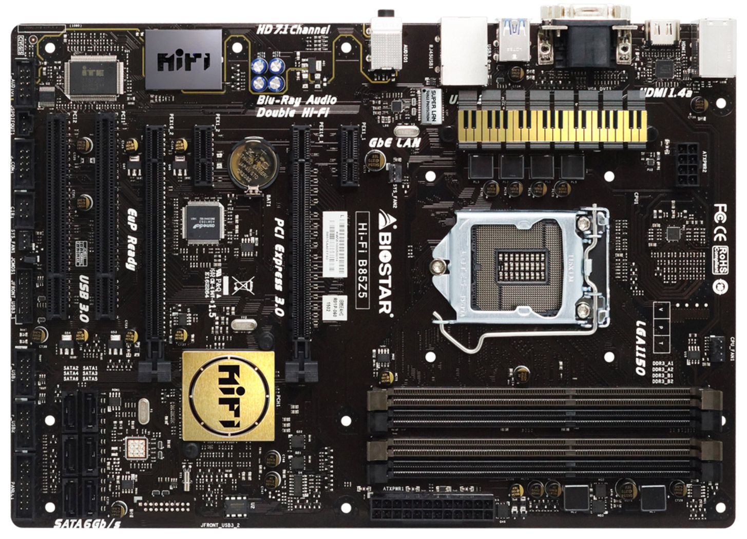 На задней панели Biostar Hi-Fi B85Z5 имеются следующие разъемы: PS/2 для клавиатуры, 4x USB 2.0, 2x USB 3.0, RJ-45, 3x Mini-Jack, видеовыходы HDMI, DVI-D и D-Sub.