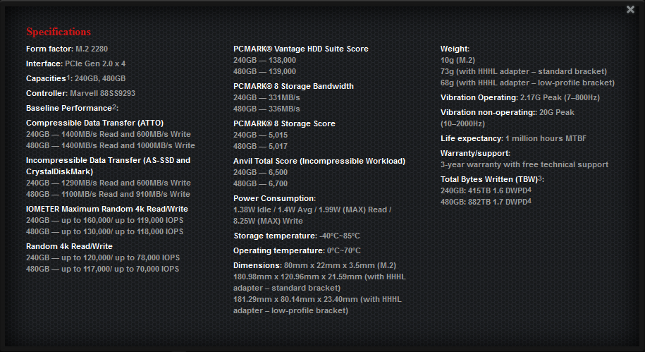 Спустя некоторое время в продаже появятся модели HyperX Predator SSD объемом 240 и 480 ГБ. Они сопровождаются трехлетней гарантией и позволяют записывать в течение этого срока 415 и 882 ТБ данных соответственно. Старшее решение, судя по цифрам из официальной спецификации (см. ниже), демонстрирует большую производительность, но заметно это будет только в отдельных приложениях, оперирующих большими объемами данных.
