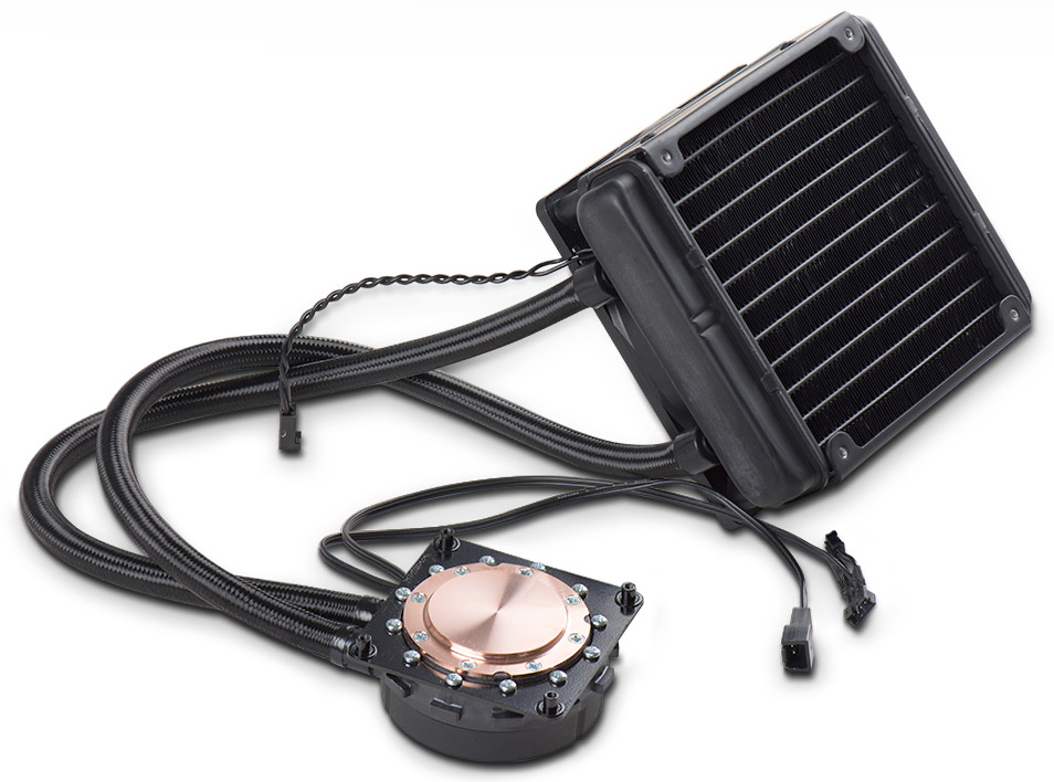 Система охлаждения состоит из водоблока с медным основанием и встроенной помпой, центробежного вентилятора, фронтальной усилительной пластины (отводит тепло от транзисторов VRM и микросхем памяти), 120-мм радиатора СВО толщиной до 30 мм и вентилятора типоразмера 120x120x25 мм.