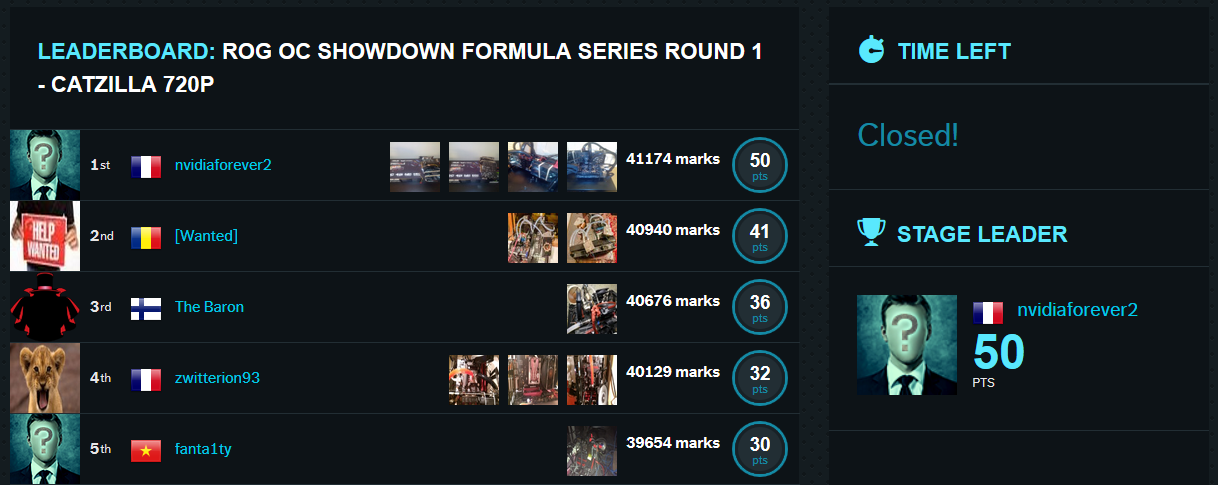 В ROG OC Showdown Formula Series Round 1 с небольшим отрывом победил французский оверклокер с запоминающимся ником Nvidiaforever2, вторым финишировал его соотечественник Zwitterion93, а остальные призовые места заняли Wanted (Румыния), The Baron (Финляндия) и Fanta1ty (Вьетнам). Украинский участник Vadimua занял 13 место.