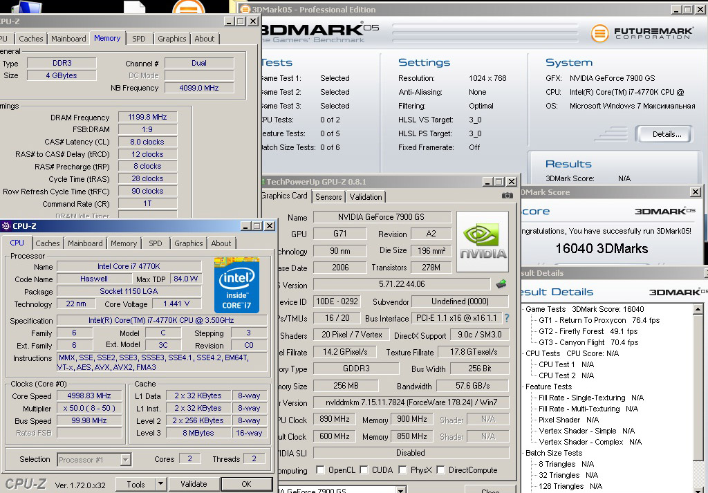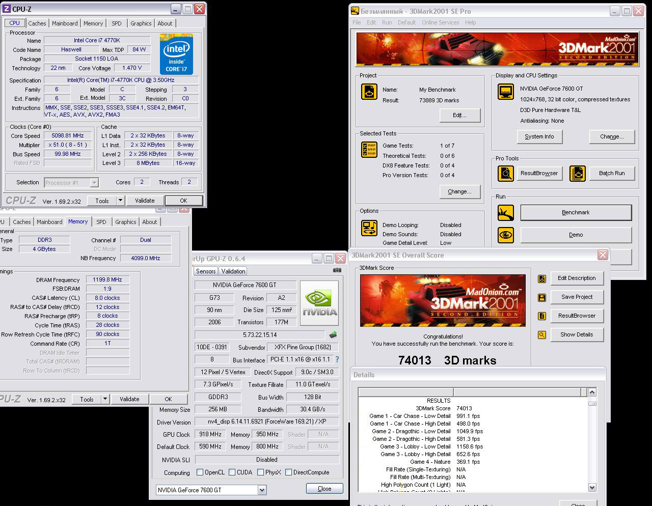 Среди прочего, Вадим стал первым в дисциплинах 3DMark2001 SE с 7600 GT и 3DMark05 с 7900GS. Разгон младшего адаптера составил 918/1900 МГц (ядро/память), старшего — 890/1800 МГц. Для тестов использовались: процессор Intel Core i7-4770K (2 ядра @5,0-5,1 ГГц), 4 ГБ оперативной памяти DDR3 с эффективной частотой 2400 МГц, материнская плата серии Asus ROG Hero и система жидкостного охлаждения.