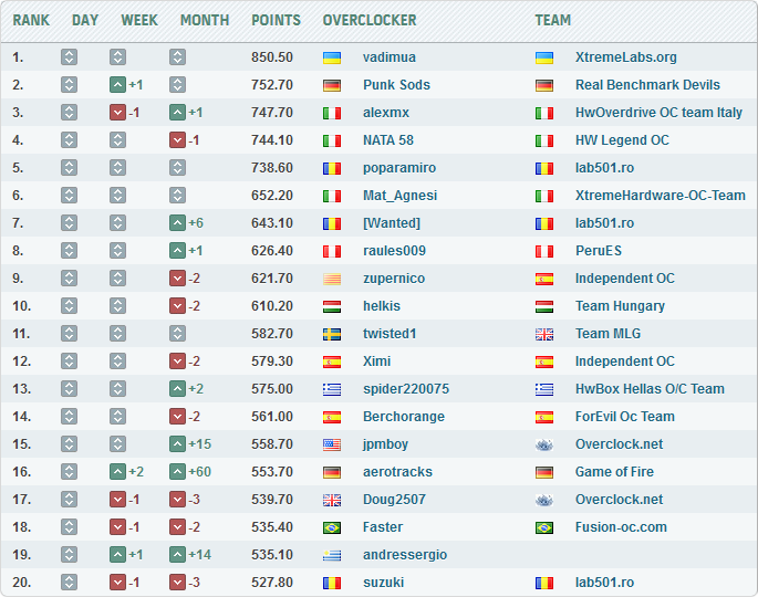 Помимо двух виртуальных золотых наград, Vadimua получил три серебряных — за вторые места в Aquamark и 3DMark03 с 7900 GS, а также в 3DMark05 с 7600 GT. Его отрыв от ближайшего преследователя в HWBot Enthusiast League составляет почти 100 очков.