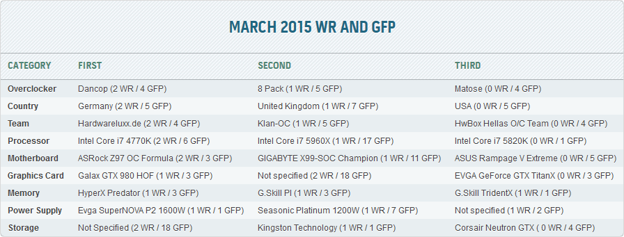 Мастера оверклокинга в прошлом месяце отдавали предпочтение процессорам Intel Core i7-4770K и i7-5960X, материнским платам ASRock Z97 OC Formula, Gigabyte X99-SOC Champion и Asus Rampage V Extreme, видеокартам Galax GeForce GTX 980 HOF и EVGA GeForce GTX Titan X, оперативной памяти Kingston HyperX Predator и G.Skill Pi, блокам питания EVGA SuperNova P2 1600W и Seasonic Platinum 1200W.