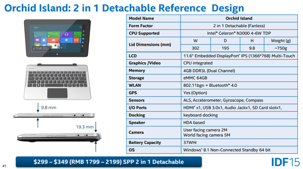 В конфигурацию «гибрида» входят: двухъядерный процессор Celeron N3000 (1,04/2,08 ГГц, 1 МБ кэша) с графикой Intel Gen8-LP, 4 ГБ оперативной памяти DDR3L, eMMC-накопитель объемом 64 ГБ, адаптер Wi-Fi (802.11b/g/n)/Bluetooth 4.0 и аккумуляторная батарея на 37 Вт*ч. 11,6-дюймовый мультисенсорный экран Orchid Island изготовлен в рамках технологии IPS и имеет разрешение 1366x768 пикселей. Толщина ноутбука не превышает 19,3 мм.
