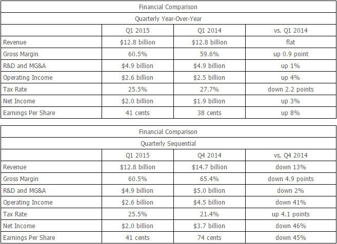 В последние годы мы привыкли, что доходы корпорации Intel растут независимо от конъюнктуры рынка, в том числе появления новых типов устройств и форм-факторов. Тем не менее в первом квартале 2015-го рост, по сравнению с тем же периодом прошлого года, практически остановился, причем статистику несколько скрасило снижение налоговой ставки с 27,7% до 25,5%. Относительно IV квартала прошлого года доход Intel Corporation упал на 13% (до 12,8 млрд долларов), а прибыль — на 46% (до $2,0 млрд).