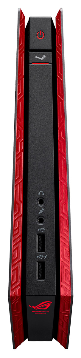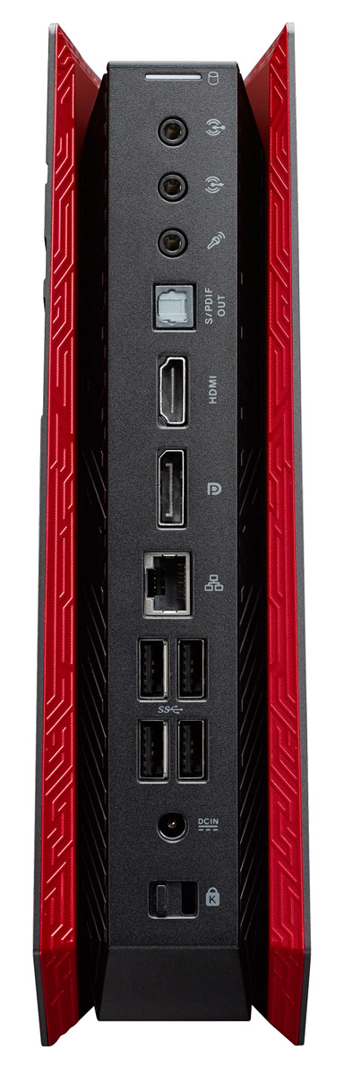 На боковых гранях Asus ROG GR6 находятся порты USB 3.0 (4), USB 2.0 (2), RJ-45, аудиоразъемы, видеовыходы HDMI и DisplayPort, оптический S/PDIF, замок Kensington и разъем для внешнего блока питания, который включен в комплект поставки.