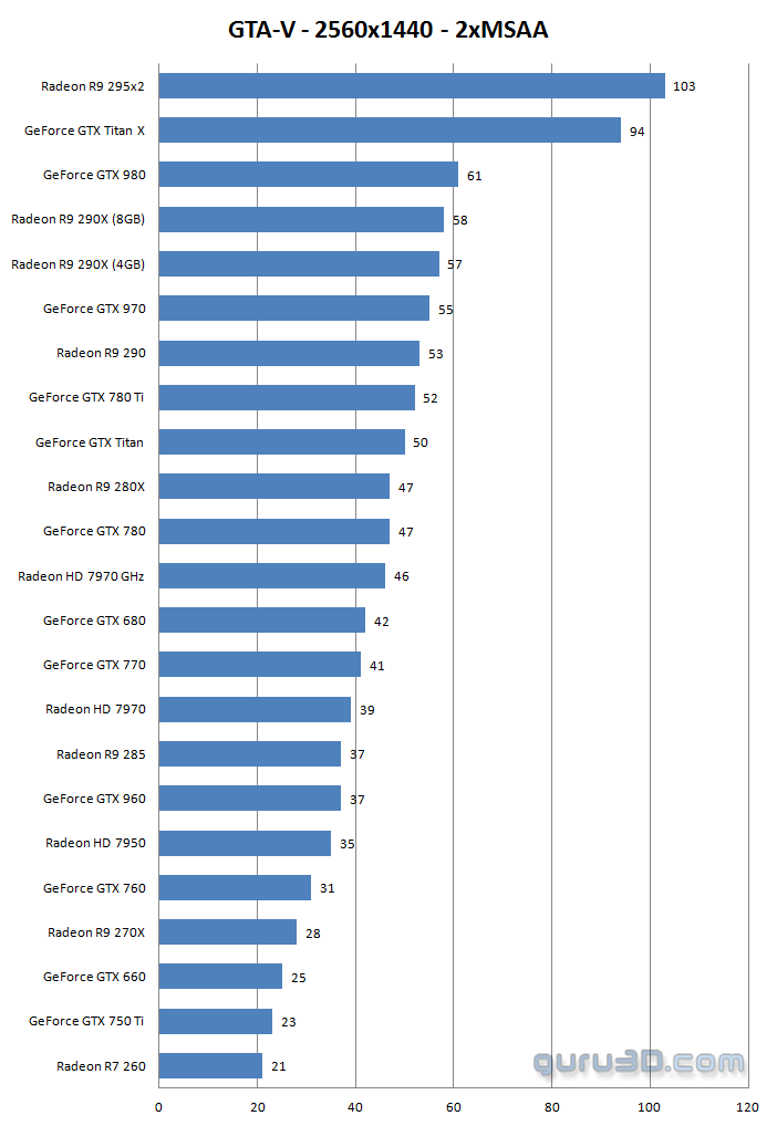По итогам тестирования нельзя сказать, что GTA V благоволит исключительно к картам Nvidia или к моделям от AMD. Лучшую производительность демонстрируют топовые видеоускорители GeForce GTX Titan X и Radeon R9 295X2, которые, можно сказать, обязательны для игры в режиме 3840x2160. В более скромных разрешениях хорошо показывают себя GeForce GTX 980, Radeon R9 290X и их собратья. Попытаться запустить Grand Theft Auto V можно и на GeForce GTX 750 или Radeon HD 7770, но насколько приятно будет играть на подобных бюджетных адаптерах — большой вопрос. Отметим, что основой тестового стенда являлся 8-ядерный процессор Intel Core i7-5960X (@4,4 ГГц).