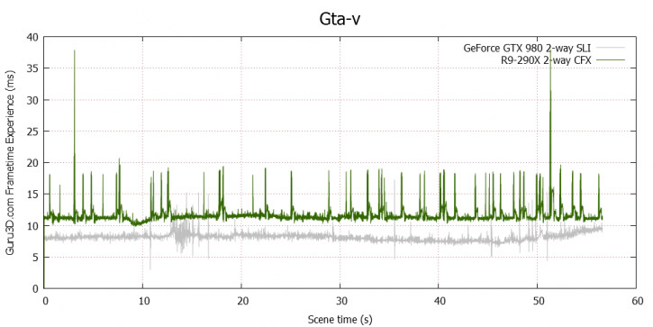 Время кадров у одночиповых GeForce и Radeon невелико, и подергивание изображения (micro-stuttering) не должно ощущаться. А вот в режиме 2-Way CrossFireX карты Radeon R9 290X проявляют себя не лучшим образом.