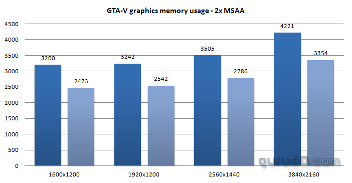 По данным мониторинга утилиты MSI Afterburner (синие столбцы), использование видеопамяти у Radeon R9 290X 8 ГБ выше, чем показывает сама игра (бледно-синие столбцы). Для 4K-геймплея требуется порядка 4,2 ГБ буферной памяти GDDR5. Чтобы «вписаться» в 4 гигабайта, стоит снизить настройки качества графики.