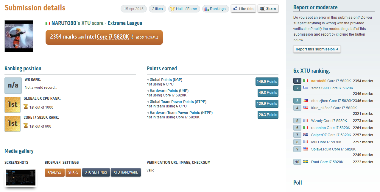 Возможно, в лице Naruto80 Италия, наконец, обретет своего «тяжеловеса», способного сражаться за лидерство в Elite-лиге с Dancop и 8 Pack. Накануне этот любитель аниме (судя по никнейму и аватару) поразил оверклокерское сообщество рекордом в тесте Intel XTU 6xCPU, набрав 2354 очка с помощью разогнанного до 5,81 ГГц процессора Core i7-5820K. У Sofos1990, предыдущего лидера в данной дисциплине, аналогичный CPU работал на 5,88 ГГц, и он набрал только 2346 очков. Оба энтузиаста использовали для охлаждения процессора жидкий азот.