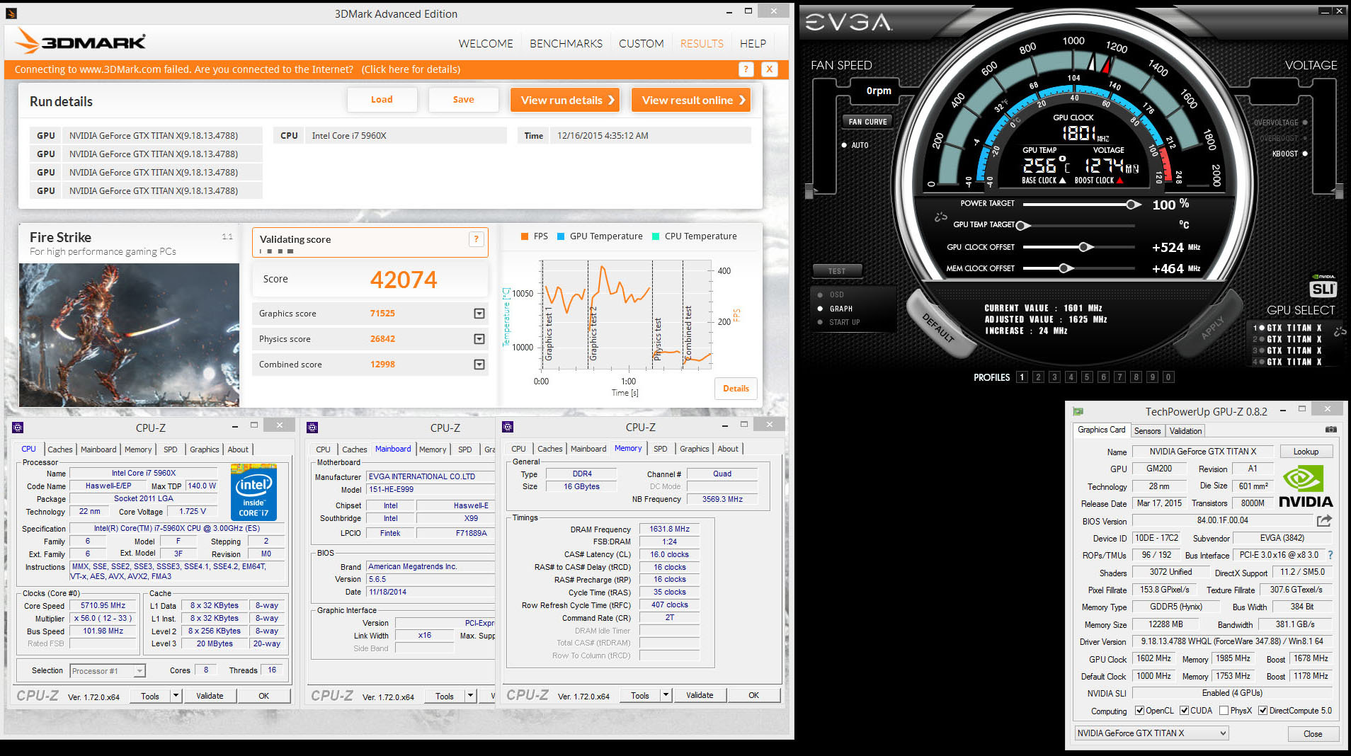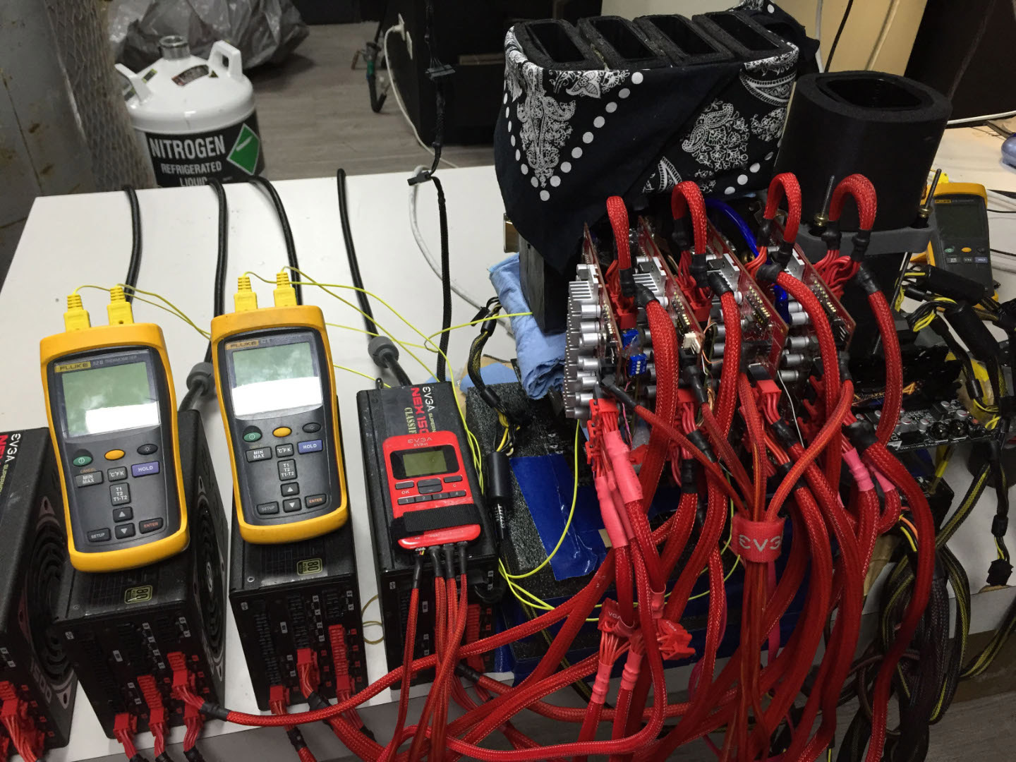 И в 2-Way, и в 4-Way SLI американцу удалось разогнать карты Titan X до 1860/7940 МГц для ядра и памяти соответственно. К стенду были подключены пять блоков питания (в том числе четыре EVGA SuperNova NEX1500 Classified), а охлаждение осуществлялось с применением LN2-испарителей KingpinCooling.