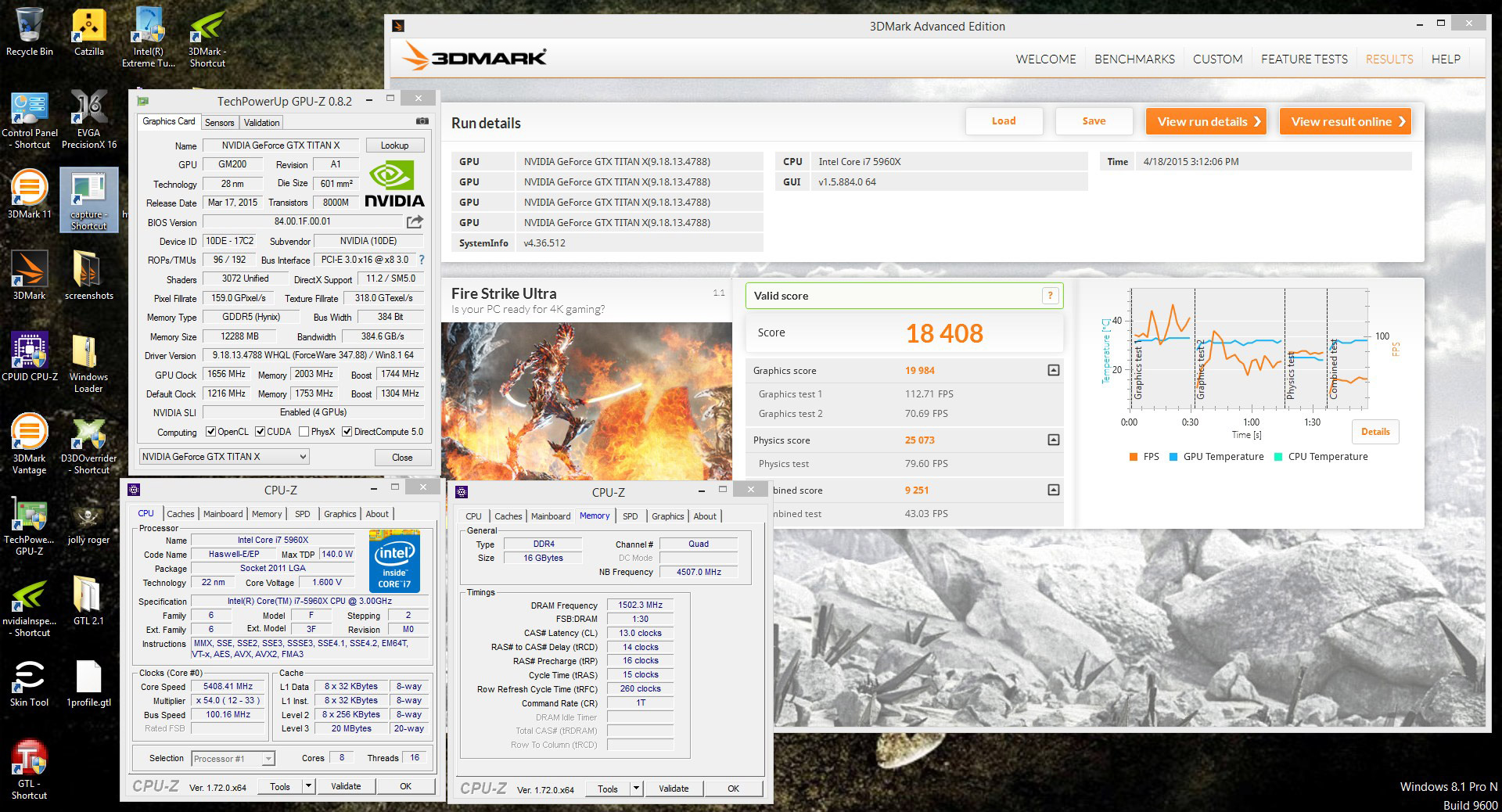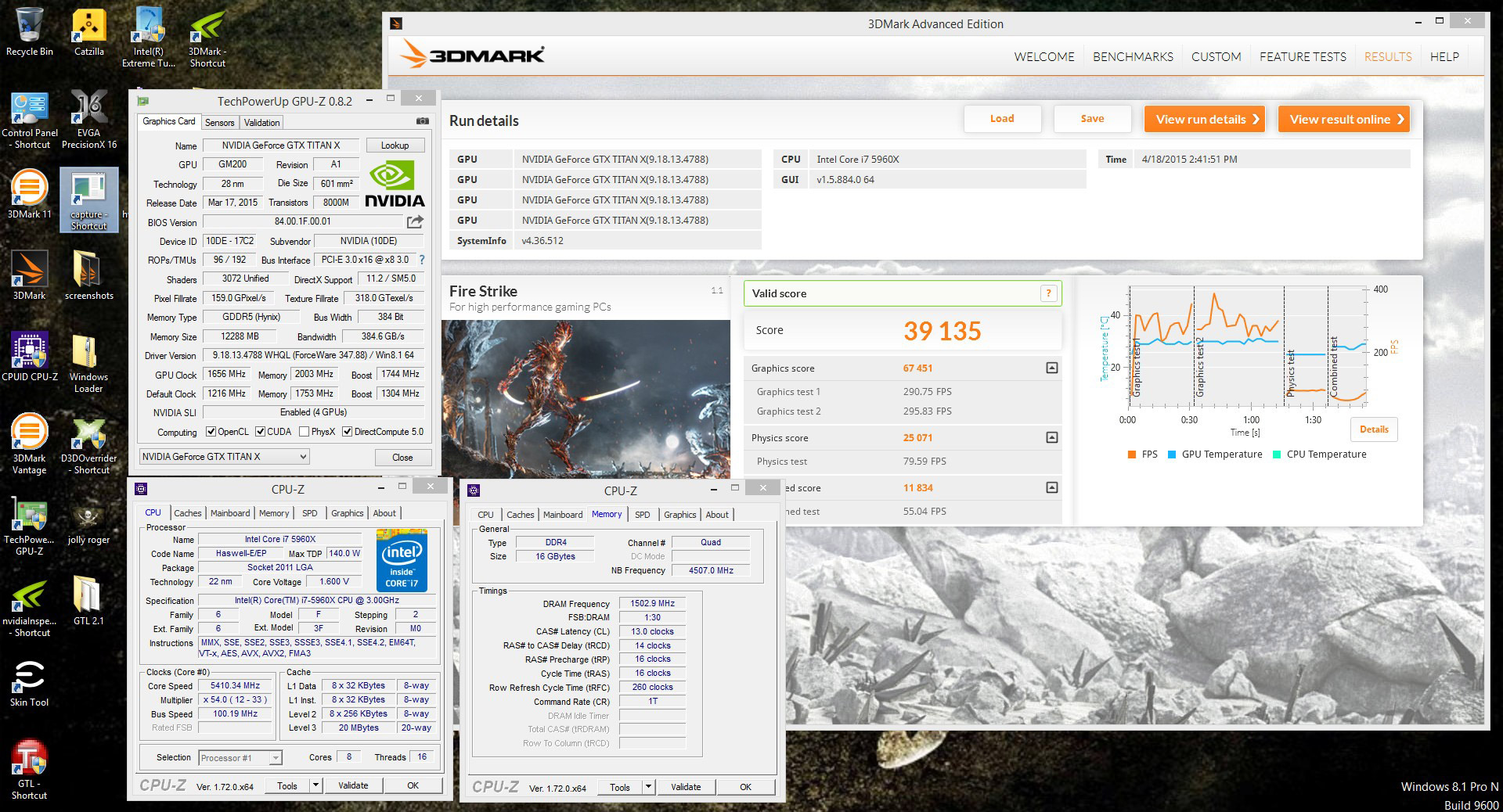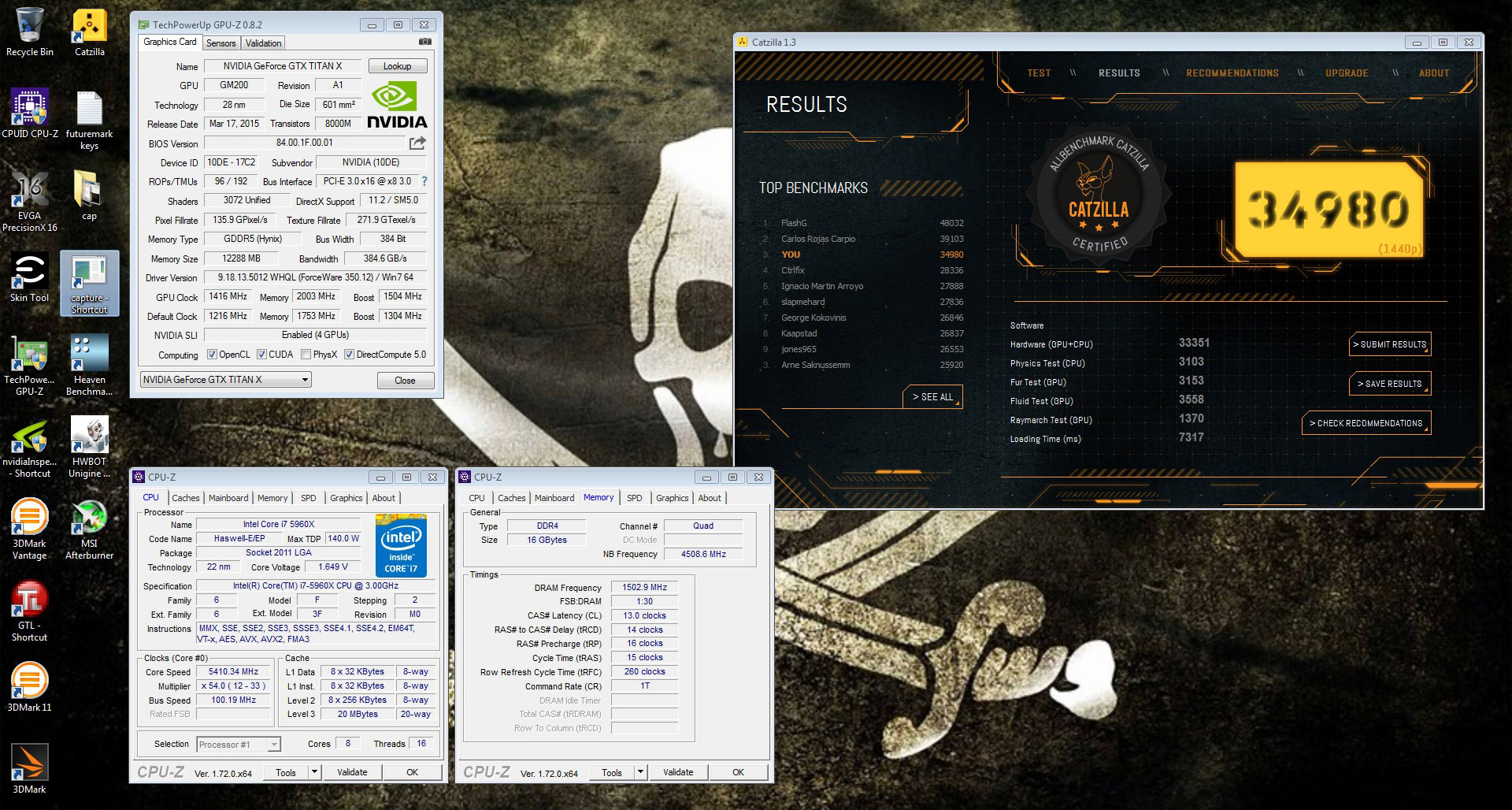 Тестовый стенд включал материнскую плату Gigabyte GA-X99-SOC Champion, 8-ядерный процессор Intel Core i7-5960X (5410 МГц при 1,65 В), 16 ГБ (4x4 ГБ) оперативной памяти Kingston HyperX DDR4 (@3006 МГц, тайминги 13-14-16-15), четыре видеокарты GeForce GTX Titan X (@1515/8012 МГц) и, вероятно, испаритель(-и) для жидкого азота.