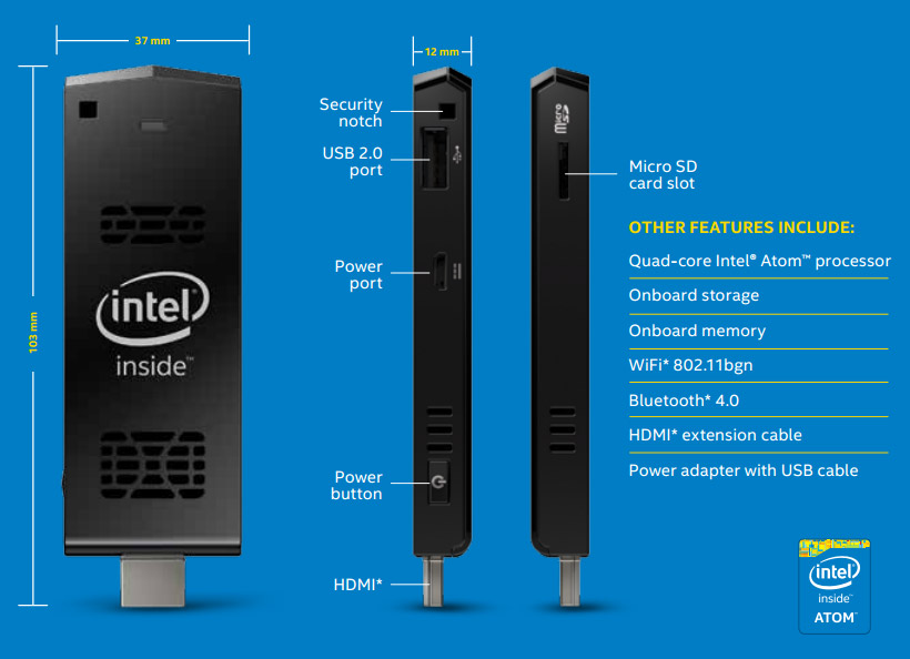 Основой Compute Stick служит четырехъядерный SoC Intel Atom Z3775F, работающий на небольшой частоте (1,33 ГГц). Кроме того, новинка содержит распаянные на PCB (90x30 мм) микросхемы оперативной памяти DDR3L-1333 и флеш-памяти eMMC, адаптер Wi-Fi (802.11b/g/n)/Bluetooth 4.0, слот для карт microSD (поддерживаются накопители SDXC v3.0 UHS-I), порт USB 2.0, аудиокодек Intel HD. Для питания Intel Stick используется 5 В адаптер.