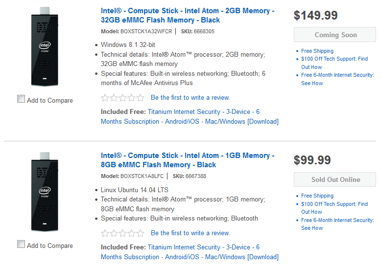 Linux-версия Intel Stick выйдет в конце мая — начале июня и будет стоить 100–110 долларов США. К сожалению, данная модель имеет всего 1 ГБ оперативной и 8 ГБ флеш-памяти, что отобьет всякое желание у энтузиастов заменить штатную ОС Ubuntu 14.04 LTS какой-либо версией Windows.
