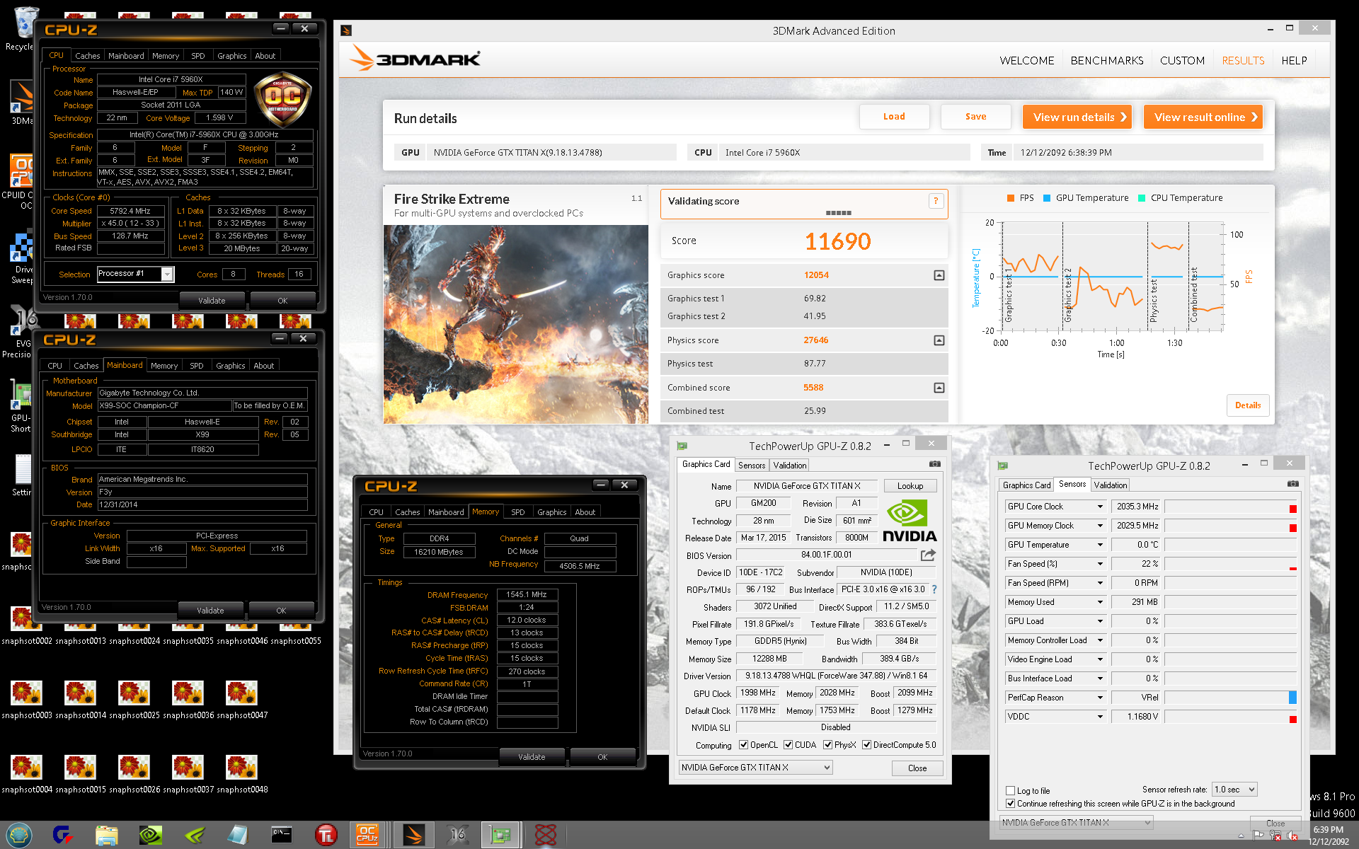 Отборный 8-ядерник линейки Haswell-E был разогнан до 5792 МГц, память Kingston HyperX DDR4 работала на эффективной частоте 3090 МГц с таймингами CL12, видеокарта Titan X функционировала на частотах 2035,3/8118 МГц (ядро/память). Эти цифры впечатляют, но все-таки легенде оверклокерского цеха K|ngp|n удалось выжать из Titan X немного больше — 2050 МГц в тесте 3DMark Fire Strike Ultra. Основой стенда Steponz служила материнская плата Gigabyte GA-X99-SOC Champion.