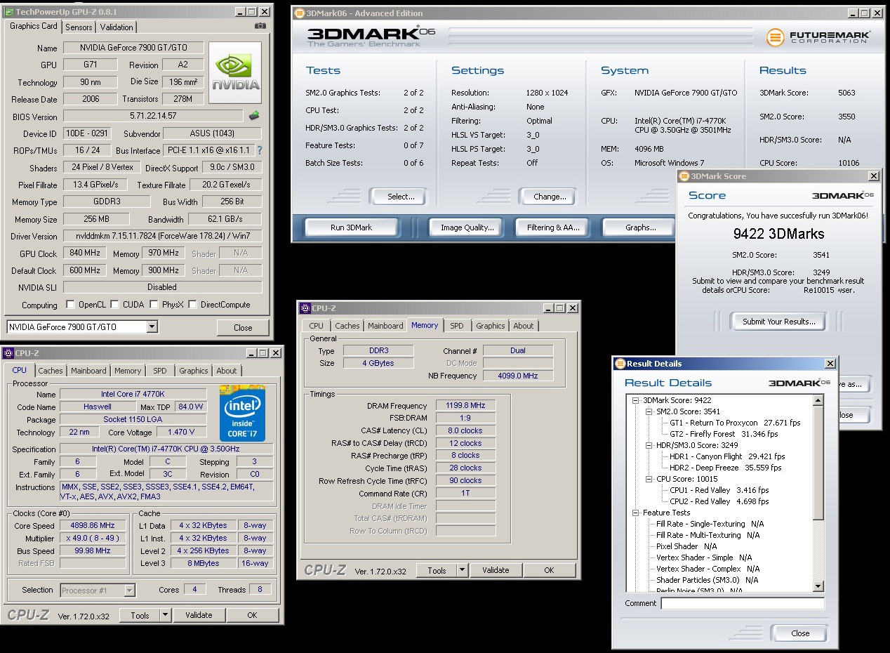 Результат в 3DMark06 составил 9422 очка. В стенд был включен двухканальный комплект оперативной памяти DDR3 (@2400 МГц, CL8-12-8-28) объемом 4 ГБ и четырехъядерный процессор Intel Core i7-4770K (@4,9 ГГц, 1,47 В).