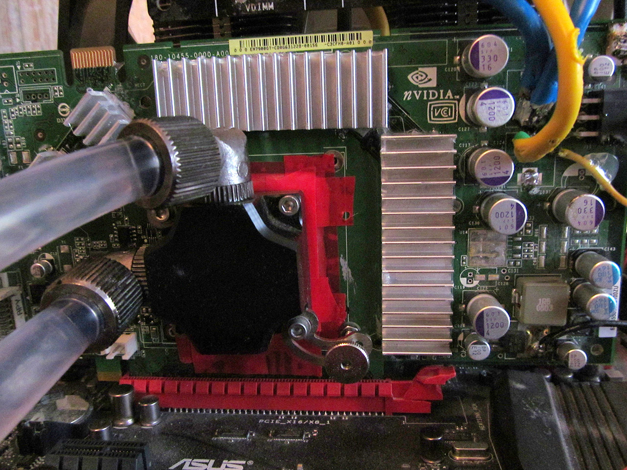 Модель 7900 GT эталонного дизайна Nvidia была разогнана до 840/1940 МГц для ядра и памяти соответственно. Судя по приложенному снимку, карта подверглась вольтмоду, а штатная система охлаждения была заменена самодельной СВО. Дополнительно устанавливались радиаторы на микросхемы памяти GDDR3.