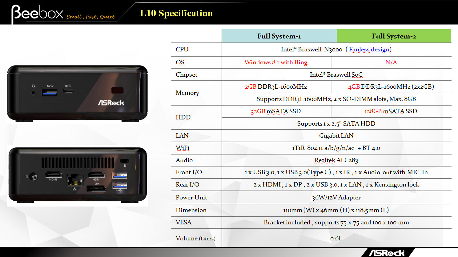 В корпусе размером 118,5(Д) x 110(Ш) x 46(В) мм установлены: SoC Intel Celeron N3000 (Braswell) с тактовой частотой от 1,04 до 2,08 ГГц, 2 или 4 ГБ оперативной памяти DDR3L-1600 (максимум 8 ГБ), накопитель mSATA SSD объемом 32 или 128 ГБ; также имеются сетевые адаптеры Gigabit Ethernet и Wi-Fi (802.11ac)/Bluetooth 4.0, и аудиоконтроллер Realtek ALC283. В комплект поставки входят внешний блок питания номиналом 36 Вт, крепление VESA 75x75 мм и, возможно, пульт ДУ. Операционная система Windows 8.1 with Bing предусмотрена только для младшей версии BeeBox с 2 ГБ ОЗУ и 32 ГБ SSD-накопителем.