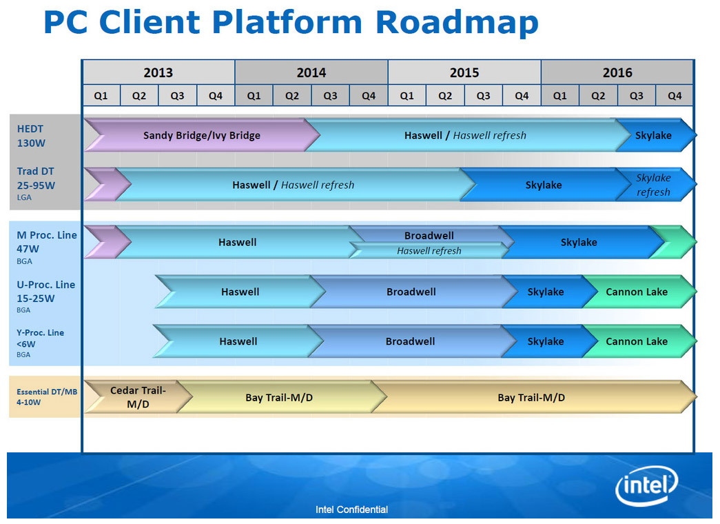 В мейнстрим-сегменте, предположительно в августе-сентябре, состоится запуск платформы LGA1151 и процессоров Skylake-S во главе с четырехъядерным Core i7-6700K. Чуть раньше, скорее всего в июне, увидят свет оверклокерские CPU Core i7-5775C и Core i5-5675C (Broadwell) для материнских плат LGA1150 на чипсетах Z97 и H97. В соответствии с опубликованной дорожной картой, в III квартале следующего года выйдут модели Skylake Refresh (LGA1151).