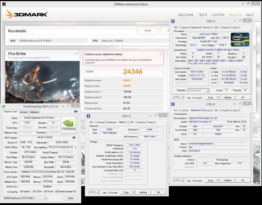 Тестовая система включала разогнанную до 2037/8012 МГц (ядро/память) видеокарту Asus GeForce GTX Titan X, 8-ядерный процессор Intel Core i7-5960X (@5673 МГц), материнскую плату Gigabyte GA-X99-SOC Champion, 16 ГБ (4x4 ГБ) комплект оперативной памяти HyperX Predator DDR4 (@3094 МГц, тайминги 12-15-15-21), SSD-накопитель HyperX 120 ГБ и блок питания Super Flower Leadex Platinum 8Pack Edition 2000W.