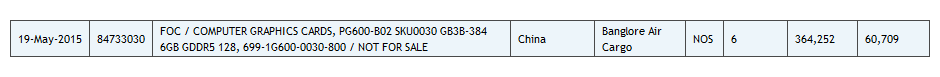 Интернет-сервис Zauba, содержащий информацию о прибытии и отправке грузов в городах Индии, зафиксировал поставку из Китая в Бангалор (штат Карнатака) шести экземпляров видеокарт с кодовым обозначением 699-1G600, которое соответствует графическому процессору GM200. Учитывая, что модель Titan X 12 ГБ уже дебютировала на рынке, можно предположить, что путешествие совершили адаптеры GeForce GTX 980 Ti.