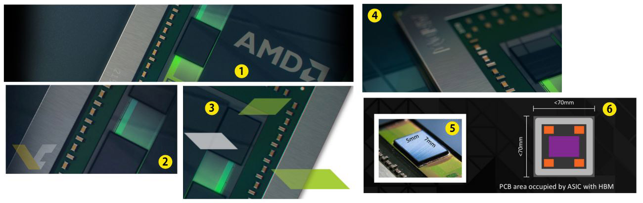 В итоге оказалось, что площадь кристалла Fiji составляет от 525 до 598 кв. мм, а сам ASIC, очерченный металлической рамкой, может занимать до 70 мм в длину и столько же в ширину (скорее всего, меньше). Размеры одного чипа HBM — 5×7 мм.