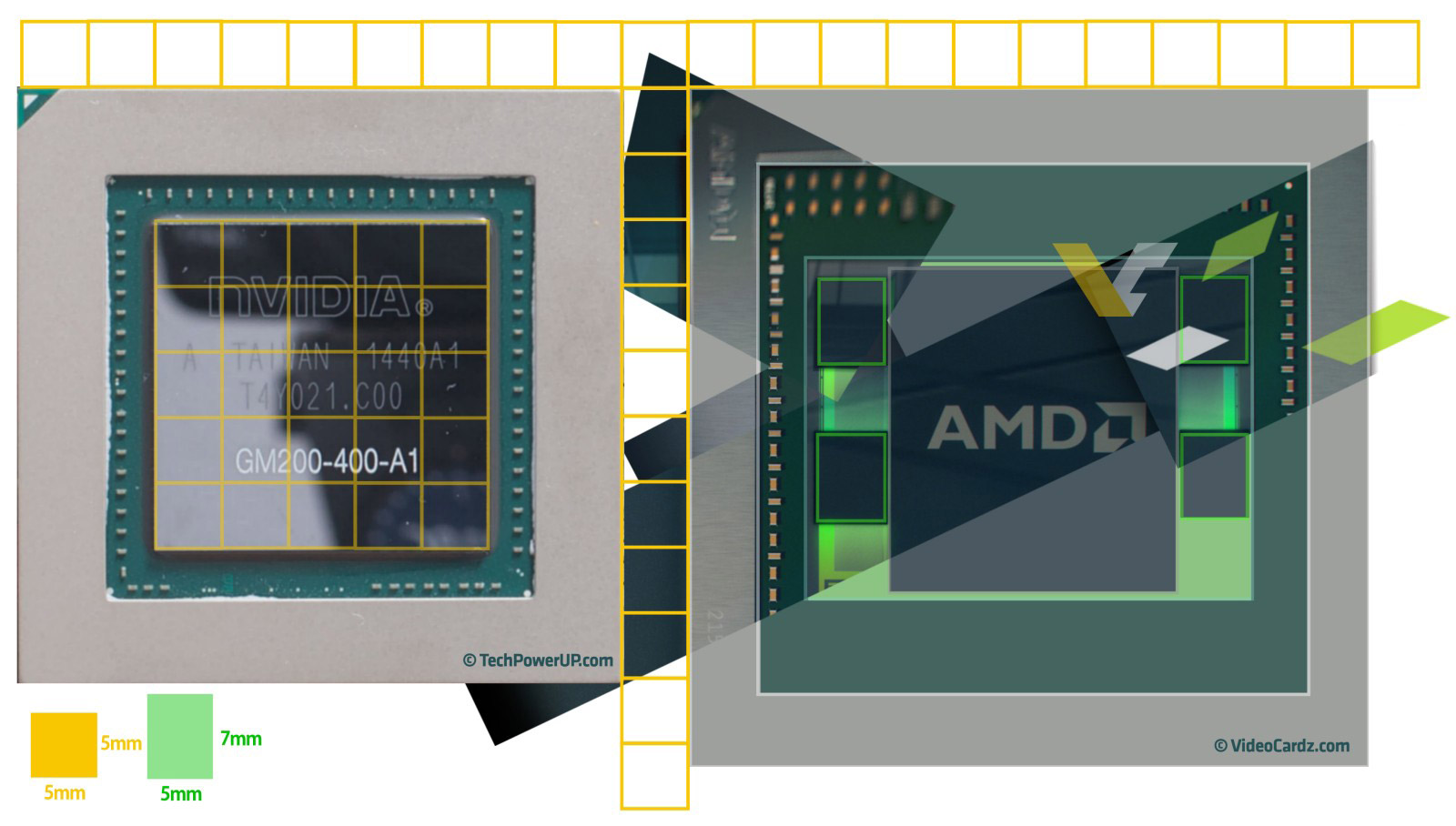 Веб-ресурс VideoCardz провел небольшое исследование, по результатам которого были установлены физические размеры ASIC AMD Fiji и его элементов — графического процессора и четырех микросхем памяти HBM, распаянных рядом с ним.