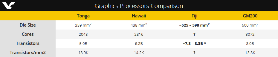 Ввиду отсутствия в составе GPU контроллеров буферной памяти GDDR5 инженерам AMD удалось создать ядро, размеры которого скромнее, нежели у Nvidia GM200 (600 кв. мм). Тем не менее Fiji будет значительно крупнее Hawaii (Radeon R9 290/290X), имея в своем арсенале от 7,3 до 8,3 млрд транзисторов.