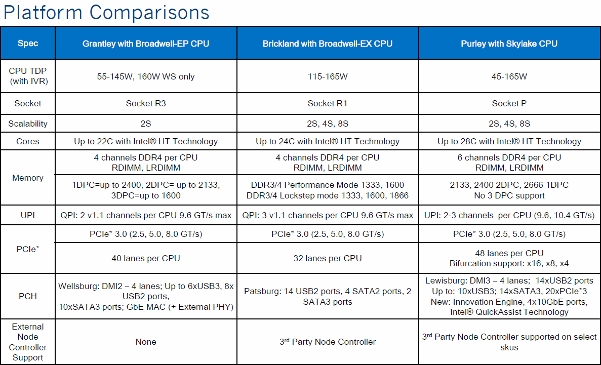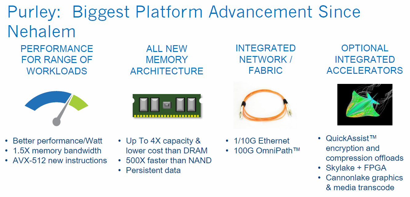 Платформа Purley охарактеризована как наиболее прогрессивная со времен Nehalem (2008). В ее состав входят процессоры Skylake (-EP/EX?), память типа RDIMM и LRDIMM DDR4 с частотой до 2666 МГц, сетевые интерфейсы Ethernet и OmniPath с пропускной способностью 10 и 100 Гбит/с соответственно, а также опциональные ASIC для шифрования и сжатия данных, вывода изображения и аппаратного ускорения медиаконтента.