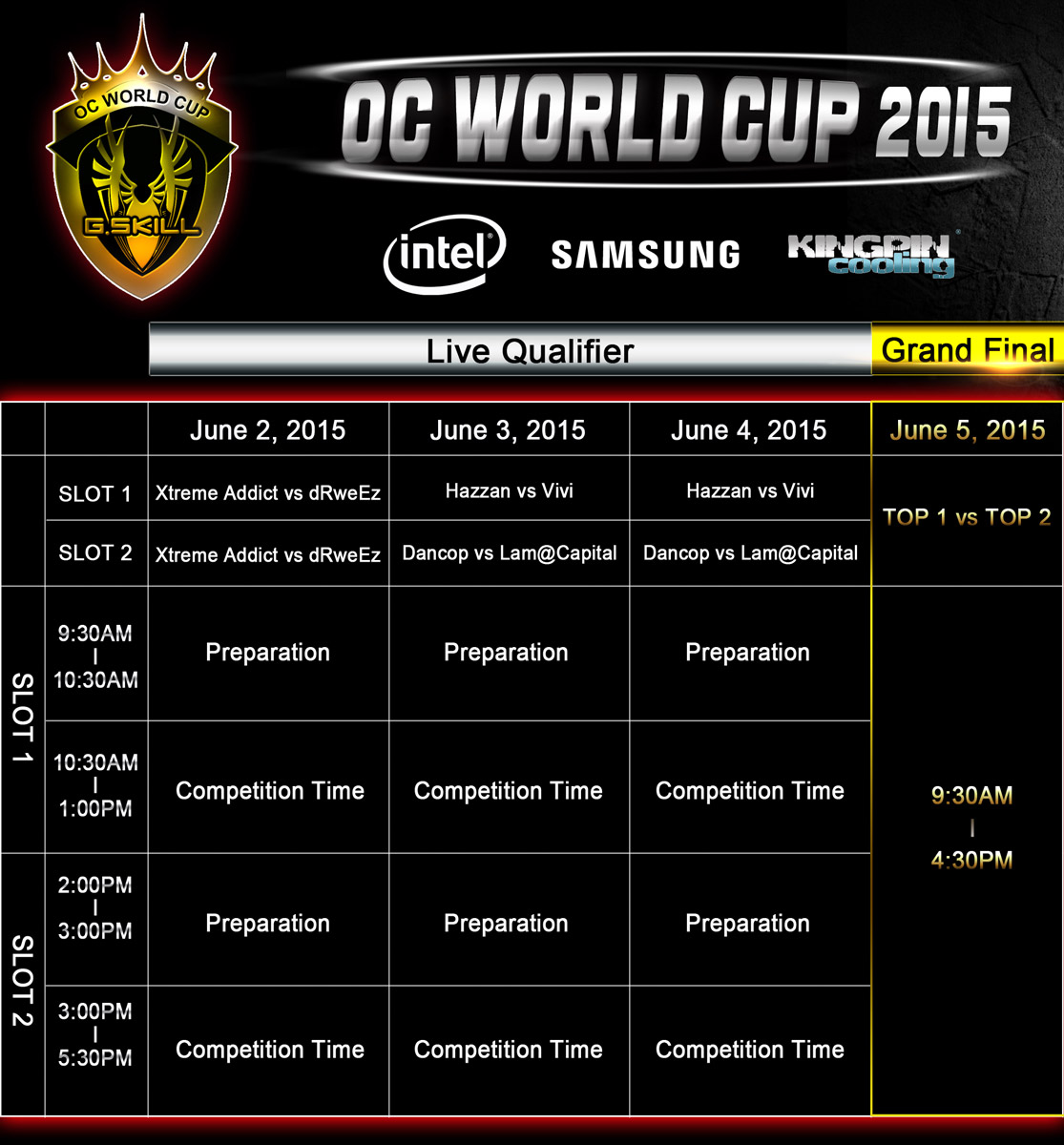 Второй турнир с названием G.Skill OC World Cup определит обладателя первого приза в размере $10000, а также чеков на меньшие суммы — от 1000 до 2500 долларов США. В составе финалистов произошла замена: отобравшийся с пятого места в квалификационном турнире американец Splave.ROM не сможет прилететь на мероприятие — его место займет представитель ЮАР под ником dRweEz.