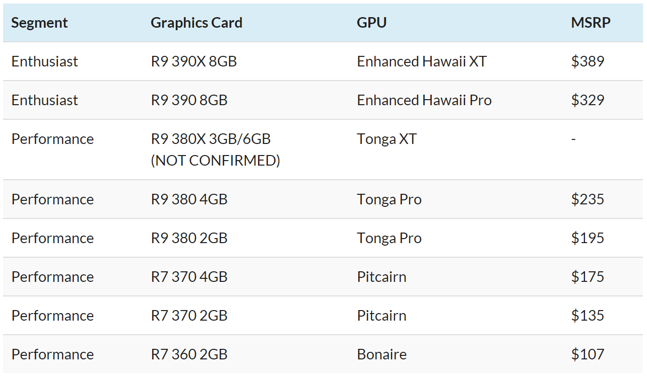 Старшие модели графических ускорителей, в лице R9 390X и R9 390, основанные на неких «улучшенных» чипах Hawaii XT и Pro соответственно, будут стоить $389 и $329 в референсных версиях. Карта Radeon R9 380 с 2 ГБ памяти обойдется потенциальным покупателям в $195, а ее 4 ГБ версия — в $235. О видеокарте Radeon R9 380X на базе GPU Tonga XT с 384-битной шиной памяти по-прежнему ничего не слышно.