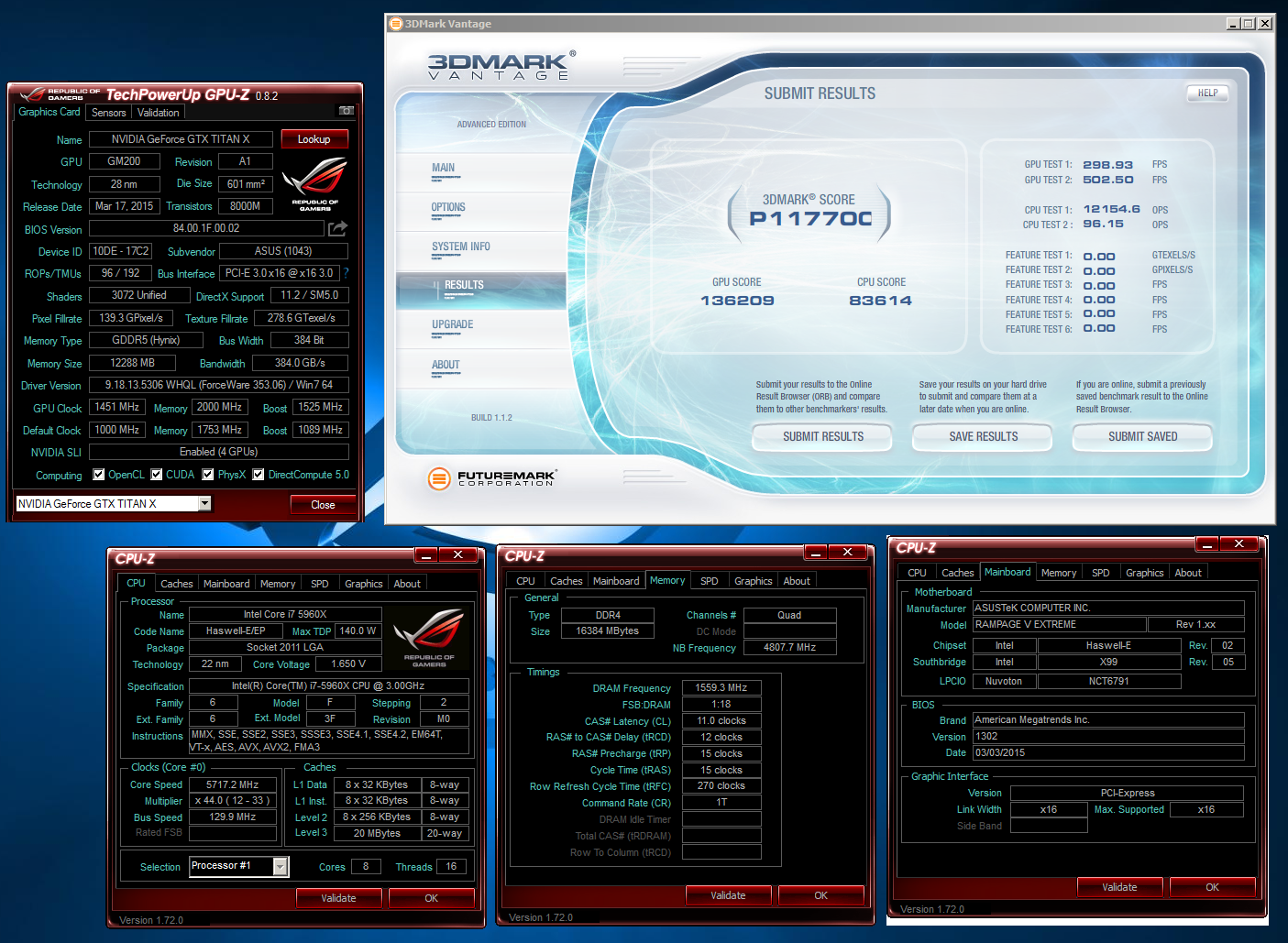 Для вышеупомянутого достижения Elmor'у понадобились четыре видеокарты Asus GeForce GTX Titan X, разогнанные до 1600/8000 МГц (для ядра и микросхем памяти GDDR5 соответственно), 8-ядерный процессор Intel Core i7-5960X (@5717 МГц, 1,65 В) и испарители для жидкого азота.