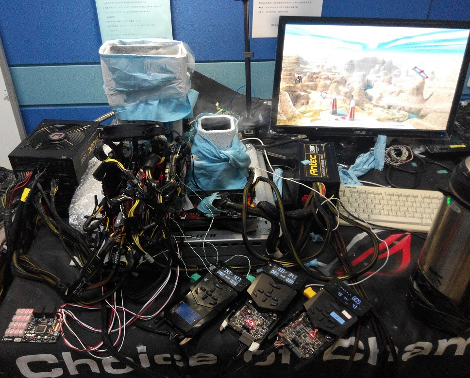 Тестовая система базировалась на материнской плате Asus Rampage V Extreme (чипсет X99). Кроме того, использовались блоки питания Antec номиналом 1200 и 1300 Вт, модули оперативной памяти G.Skill DDR4 @3119 МГц и накопитель той же марки. Разгон облегчали оверклокерские девайсы ROG OC Panel.