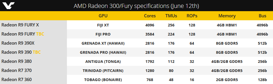 Как следует из вышеприведенной таблицы, GPU Fiji Pro получит 3584 потоковых процессора, 224 TMU, 128 ROP, 4096-битную шину памяти, 4 ГБ ОЗУ HBM1 и станет основой видеоадаптера Radeon R9 Fury (без приставки «X»). Отрадно что для Radeon R9 390 избран не урезанный чип Hawaii Pro, а Hawaii XT (он же Grenada) с 2816 шейдерными блоками. Двойной объем памяти делает его предпочтительнее собрата Radeon R9 290X.