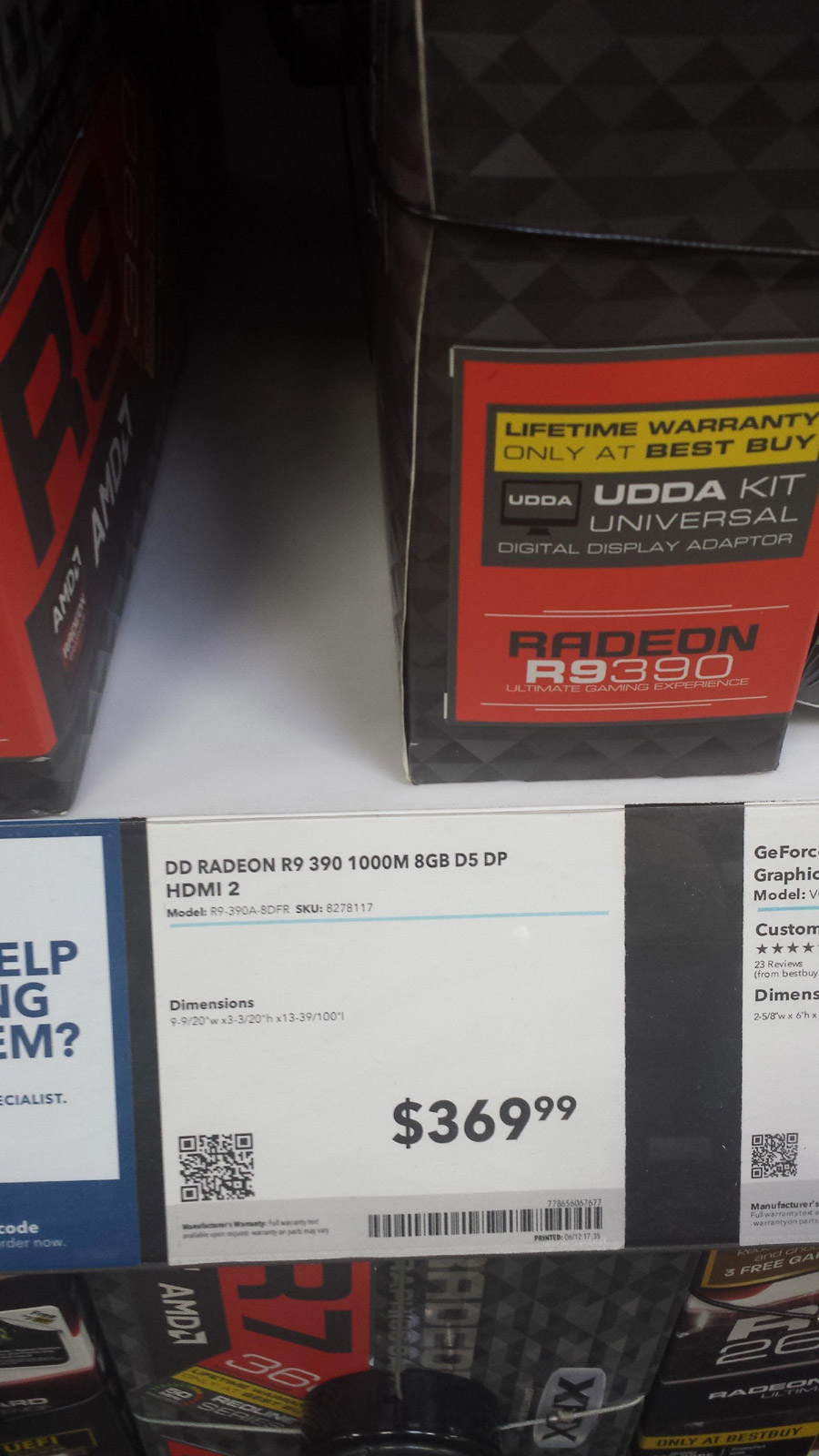 Сеть американских магазинов Best Buy получила негласное разрешение начать продажи видеокарт Radeon Rx 300. Один из участников сообщества Reddit под ником iARRpirate при посещении точки продаж Best Buy обнаружил там доступные для приобретения карты XFX Radeon R9 390 Double Dissipation и R7 360 Double Dissipation по ценам 370 и 150 долларов соответственно (без учета налога с продаж). Для сравнения был приведен ценник EVGA GeForce GTX 970 SSC с указанной на нем суммой $380.