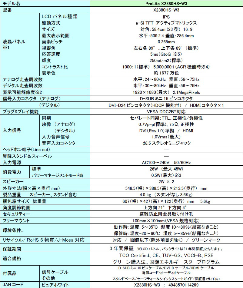 Iiyama ProLite X2380HS-W3 имеет широкие углы обзора (178°/178°), поддерживает крепления VESA 100x100 мм и характеризуется скромным энергопотреблением в экономичном режиме — 26 Вт. Отмечается, что с его установкой выбросы углекислого газа в атмосферу сокращаются с 23,9 кг до 21,8 кг в год (по сравнению с обычным режимом).